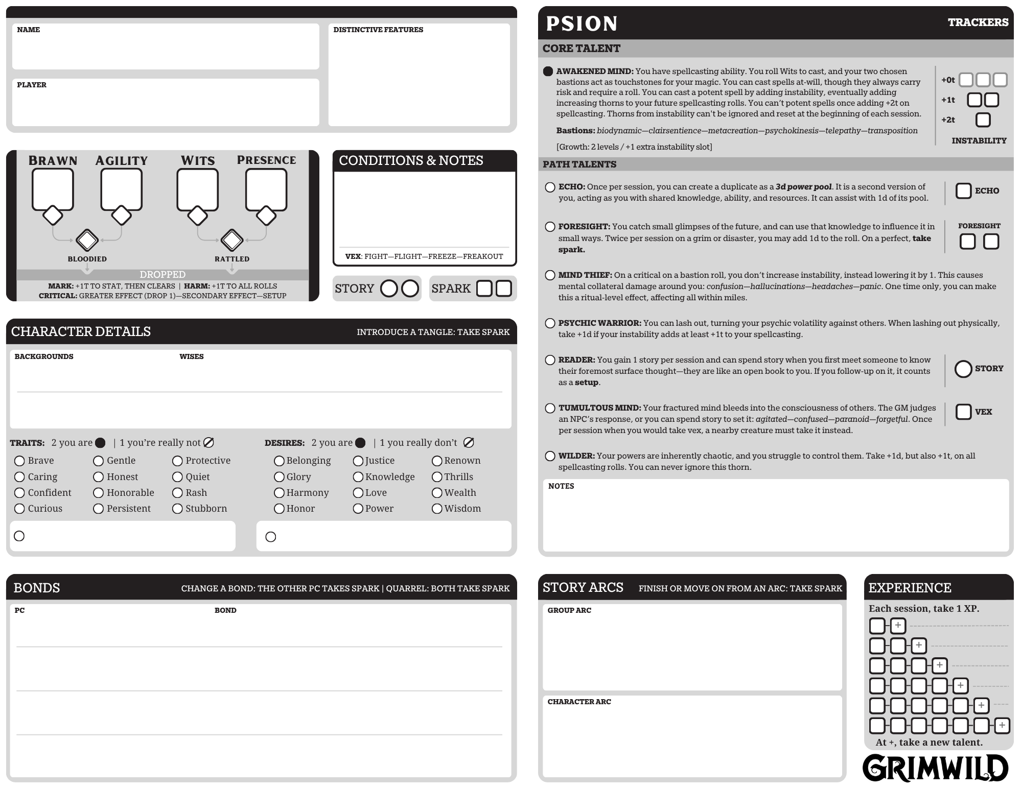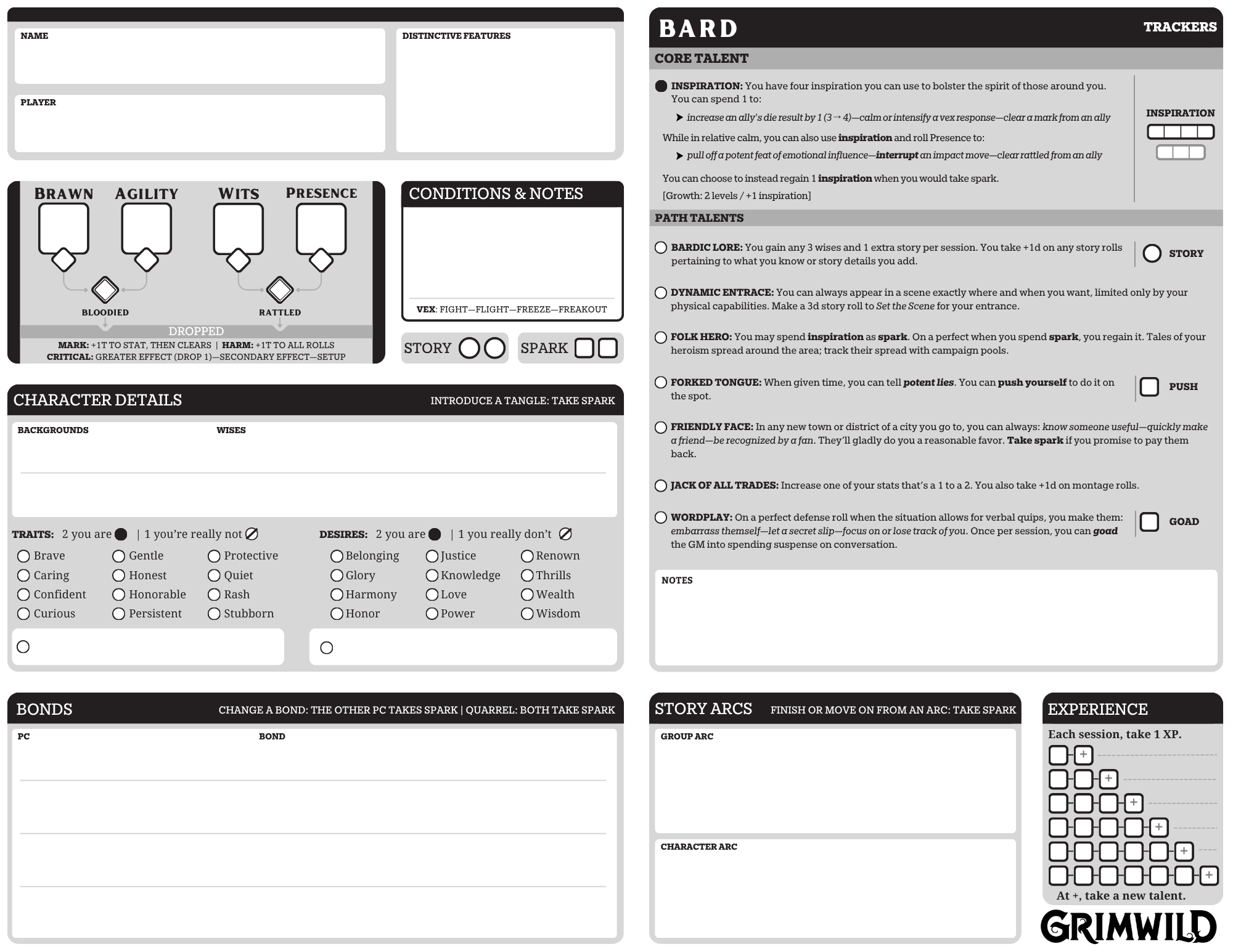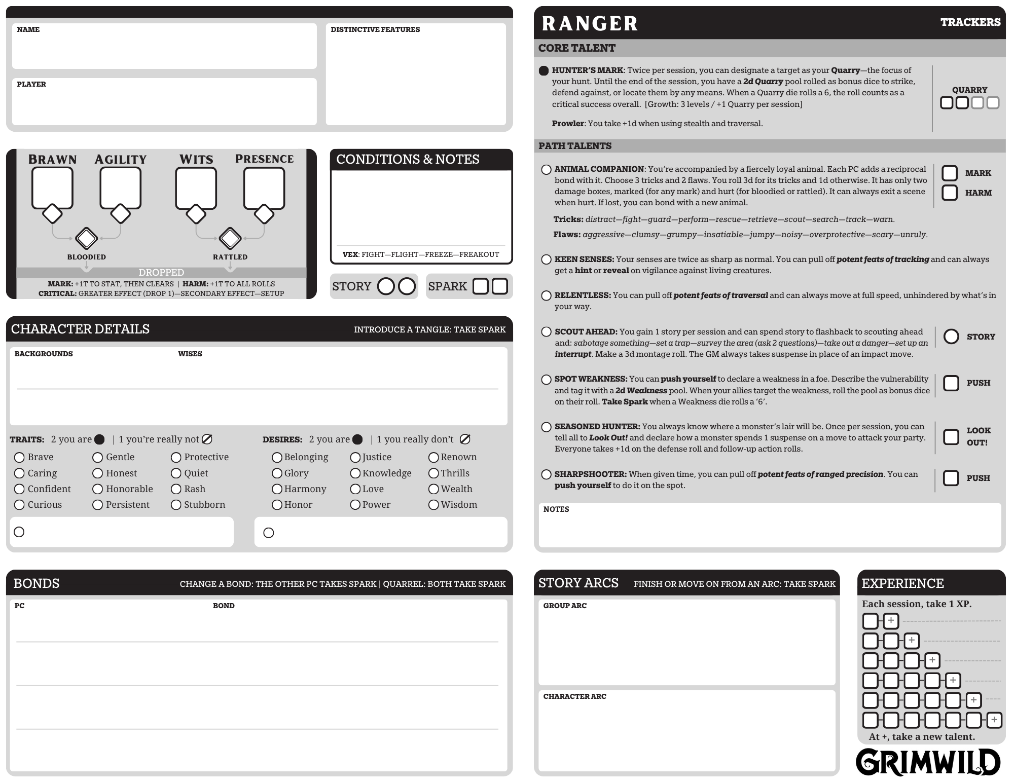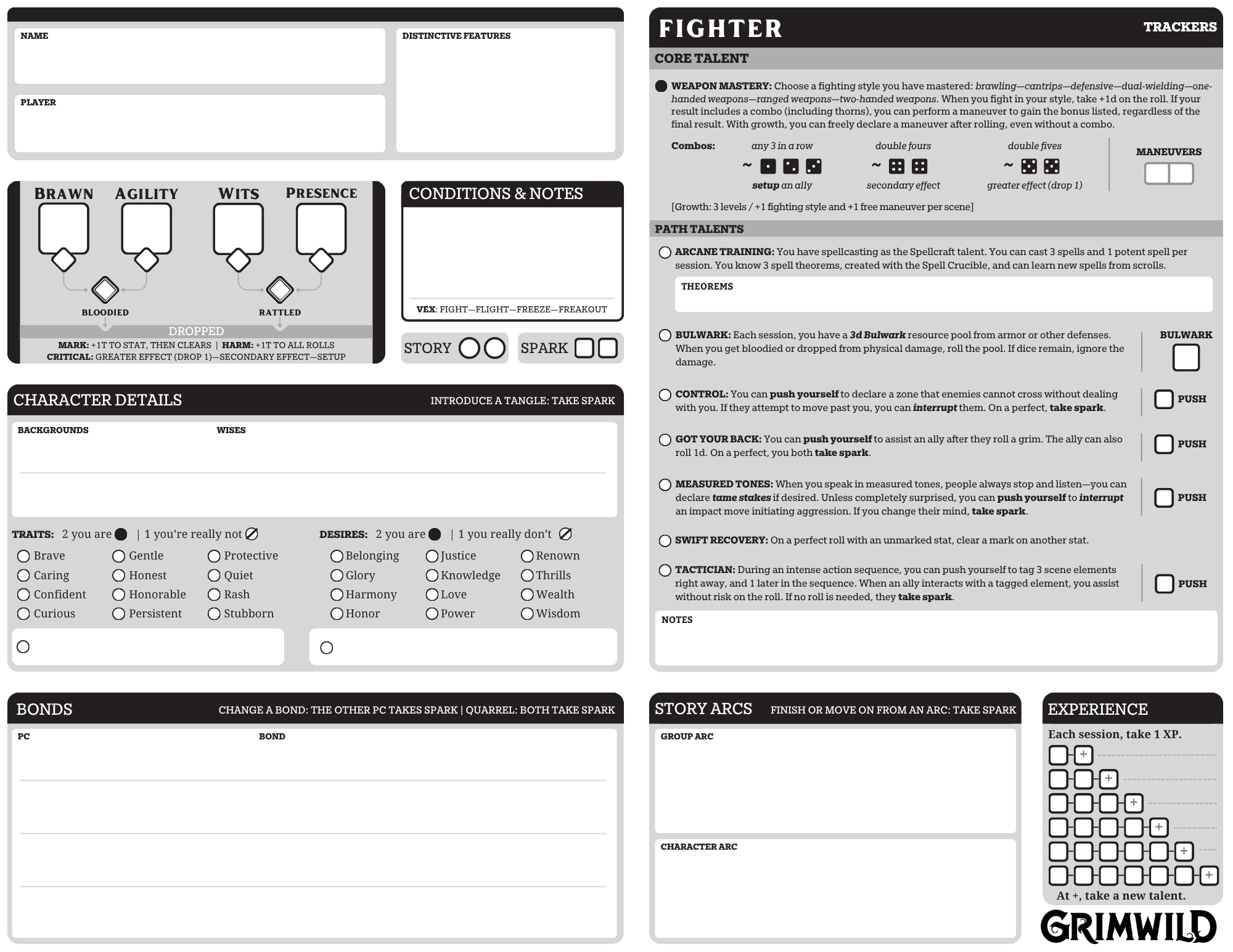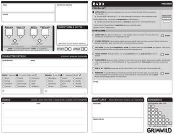 Grimwild has now been out for a year, and in that time, I've come across a few small issues in my games that I wanted to fix. This is a pack of 20 character sheets, all tweaked, clarified, or completely reworked to be on the same level.