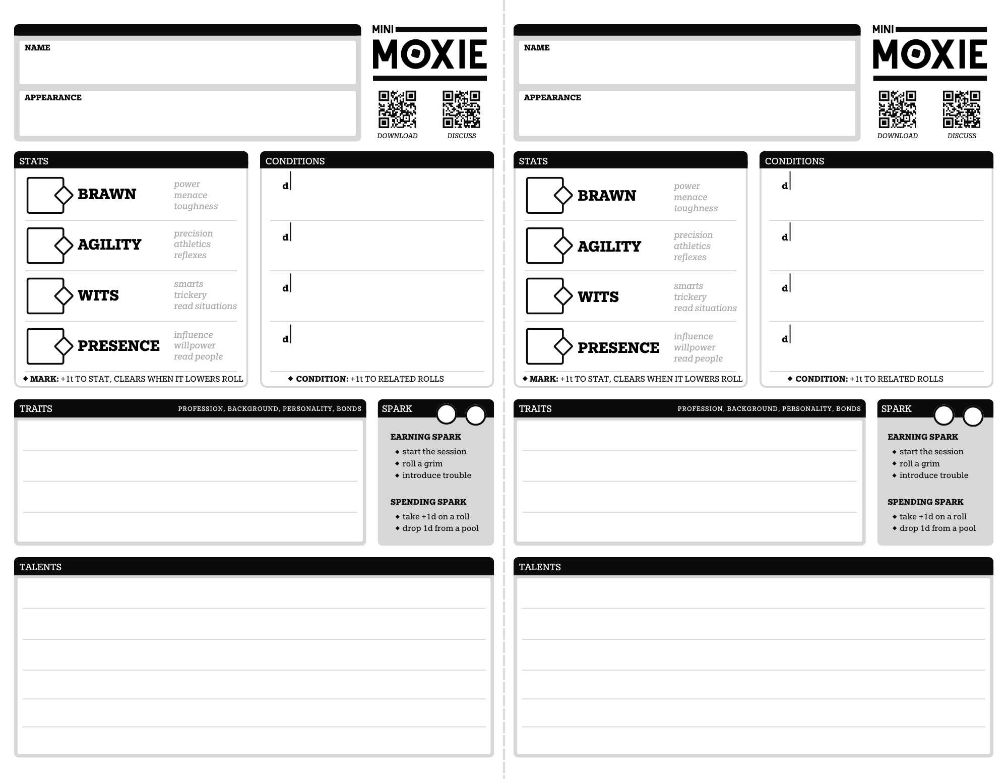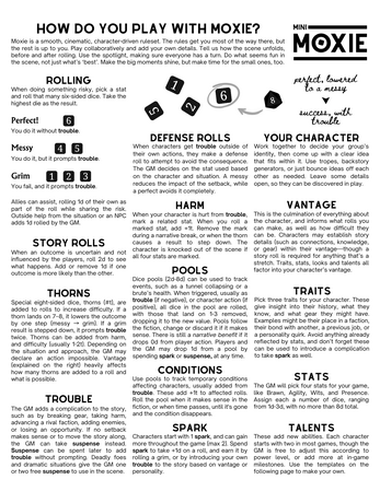 Mini-Moxie is a lightweight ruleset based on Moxie, the system used in Grimwild and The Wild Frontier of Venture. It cuts down on terminology and makes learning the game easier.